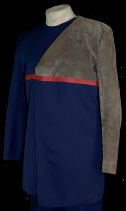Description: A costume featured in the Star Trek: Voyager episode “Cold Fire”; wherein “Voyager” encounters a group of Ocampa who help “Kes” (Jennifer Lien) to develop her burgeoning psychic abilities even further and word of “The Caretaker's” mate is brought to the ship. This costume is for wear by cult favorite Gary Graham in the role of an Ocampa elected to live with “The Caretaker’s” mate “Suspiria” who tries to lure “Kes” away from “Voyager”, “Tanis”; a long-sleeved, two-tone blue and gray suede jacket featuring a red vinyl, horizontal stripe across the front, two clasps along the chest, matching blue, overall-style trousers with stirrups for the feet. Gary Graham is better known for his role in “Enterprise” as the Vulcan Ambassador to Earth, “Soval”. A sewn in tag reads ‘Voyager, Gary Graham’ and the costumer’s tag reads ‘Voyager Cold Front, Tanis, Gary Graham’.