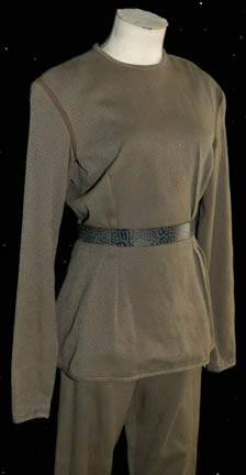 Description: A costume featured in the Star Trek: Voyager episode “Faces”; wherein Vidiians capture several “Voyager” crew members and they separate “B'Elanna Torres” (Roxann Dawson) into two fully human and fully Klingon individuals because they think that her Klingon physiology is the key to curing “The Phage”. This costume is for wear by Roxann Dawson in the role of “B’Elanna Torres”, as her fully Klingon half, and is a long-sleeved, olive-colored shirt featuring a textured maze-like pattern, pleated ribs, clasp cuff adjustment, a zip up the back, corresponding overall-style trousers, and a matching gray belt. A sewn n tag reads ‘Voyager, Roxann Biggs’.