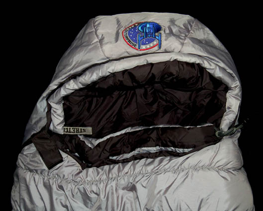 Description: A full length adult sized gray sleeping bag featured in the Star Trek: Enterprise episode “Strange New World” in which an away team from “Enterprise” camps out on a world they are scouting. The sleeping bag is a ‘Sierra Designs, Polar Guard 3D' brand bag with a zip up the left side, Velcro seals for the ‘hood’ and tightening drawstrings. The hood of the bag features a sewn on “Enterprise NX-01” assignment patch. Characters who interacted with bags like this in the episode were “T’Pol” (Jolene Blalock), “Commander Tucker” (Connor Trinneer), “Travis Mayweather” (Anthony Montgomery), and “Crewman Cutler (Katie Waymire), and “Crewman Novakovich” (Henri Lubatti).
