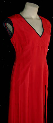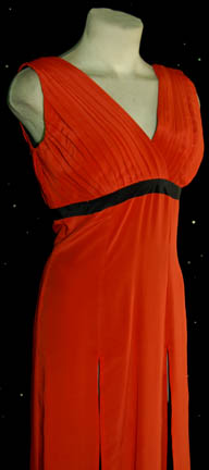 Description: A costume lot featured in the Star Trek: Voyager episode “Favorite Son”; wherein “Ensign Kim” (Garrett Wang) finds that he seems to be a member of a Delta Quadrant race who doesn't want him to leave the planet again. Inlcuded in this lot are costumes for wear by Deborah May as “Lyris”, Kellie Kirkland as “Rinna” and Ellen Alexander all as Taresians that are attempting to make “Ensign Kim” want to stay with them believe he is one of them; they are a long-sleeved, red-orange dress featuring extremely long, open sleeves, black accents around the collar; a bright red, sleeveless dress featuring pleating around the bust line, and a v-neck collar; an orange/peach, long-sleeved dress featuring numerous pleats across the chest, empire waist, and v-neck collar. A long-sleeved, gold-colored dress with the same empire waist but with the black accents around the shoulders and a squared-off collar; also included is an orange sleeveless version of the long-sleeved orange/peach dress and a pair for high-heeled shoes. All dresses have black lining and either one or two slits up the front. Sewn in tags denote wear by Ellen Alexander, Kelli Kirkland, Deborah May, and veteran Trek stunt person Pat Tallman as do the collective costumer’s tags.