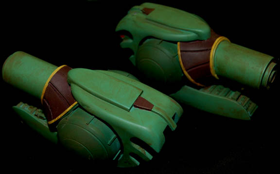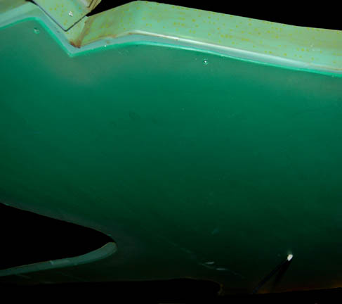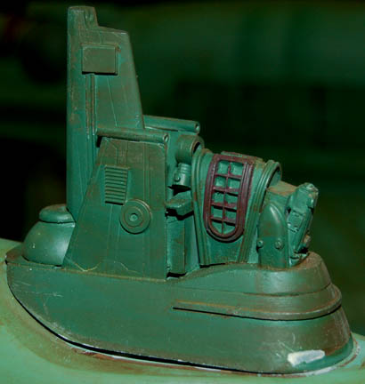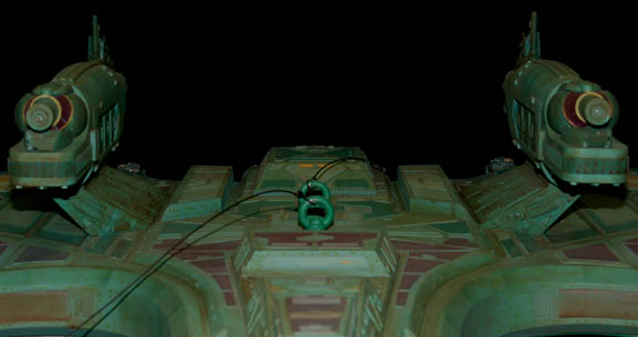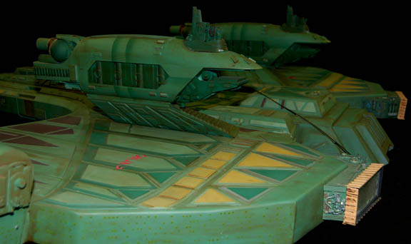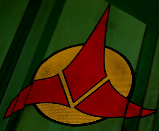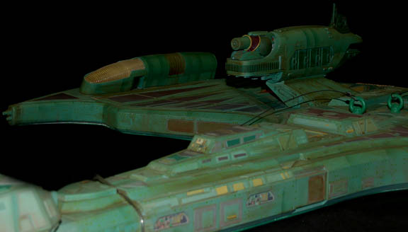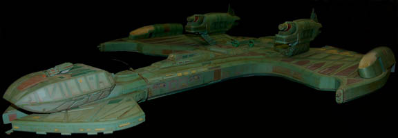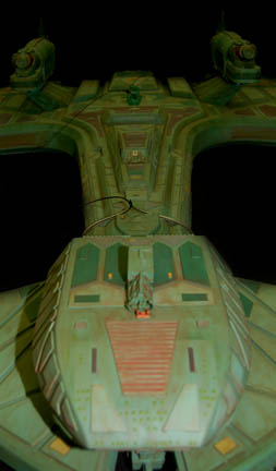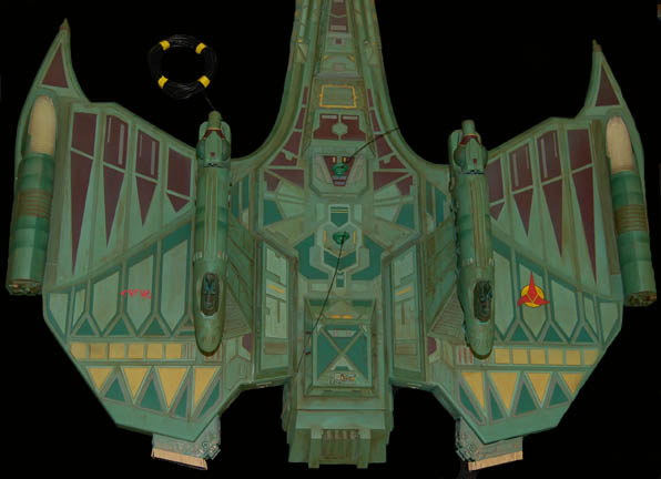 Description: First appearing in the Star Trek: Deep Space Nine episode "Way of the Warrior" as the new flagship of the Klingon Empire, this model of the "IKS Negh'var" arrived at "Deep Space Nine" on a mission to secure the Alpha Quadrant from Dominion invaders believed to have taken control of the Cardassian government. The ship was only ever seen from the underside in an effort to give the viewer a sense of its awesome size and thus the detail present on this model is excellent while the dorsal side remains featureless, though intact. Other, later ships of the same class arrived in episodes like "Shattered Mirror" and "The Emperor's New Cloak" but the model used in those episodes was a 30 foot long mock-up made to balance out the scale of the "USS Defiant" model. In fact, at approximately seven feet long, this model has perhaps a more timely history as being the first of its class since the similar ships appearing in Star Trek: The Next Generation's "All Good Thingsā¦" were of a different class altogether. Imagine! This impressive item hanging from a ceiling, seen as it was meant to be seen, striking awe into its viewers as only Klingon style design can! The ship is made of wood painted green with raised detail in mauve, dark green and yellow. Small green painted dots cover the ship to simulate windows. On each wing are warp nacelles with electrical capability however the electronics are untested. There are also numerous LED lights over the ship that are also untested. Weapons towers are on each side of the body with intricate detail. Several of the towers components are not attached but can be glued back on. On the right wing is a Klingon emblem application and on the other wing is red Klingon text. A weapon on the front of the nose is also detached but can be glued. The ship has wire supports around the nose, attached to the wings and in the center. The underside of the ship is smooth and painted green with the power cord coming out of the center. Measures approx. 84 x 68 x 13 inches.