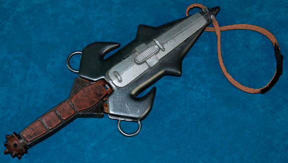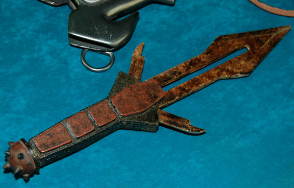 Description: A prop molded rubber Klingon D'K tagh knife with a vacuum formed sheath featured variously in Star Trek episodic television. The prop blade is really quite tough and distressed to appear aged or ‘rusty’, and features a ‘spiked’ pommel at the end of the hand grip. The sheath features attached metal rings for belt wear and is painted metallic pewter and silver with an attached tan colored band for fitting around the thigh. The item in the sheath measures approx. 17.25 X 7 X 1.75 inches.