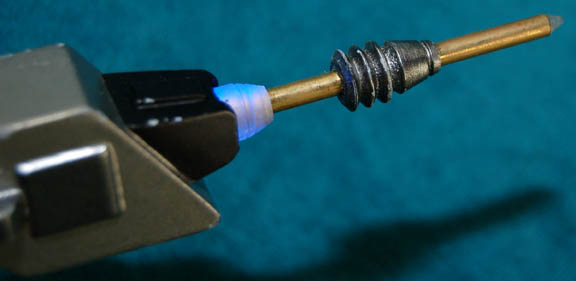 Description: A medical laser used on “Icheb's” (Manu Intiraymi) head in the Star Trek: Voyager episode “Imperfection” in which he saved “Seven of Nine’s” (Jeri Ryan) life by donating his Borg node to her. The laser is made of resin painted two shades of gray with copper color paint for detail. The tip is made of metal with additional resin components. A small button at the top of the handle activates flashing LED lights on the device. The tip flashes orange and closer to the body it flashes blue. Measures approx. 6 ½ x 3 ½ x 1 inches.