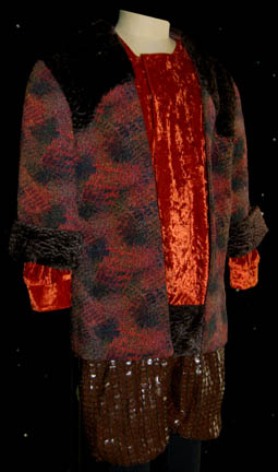 Description: A pair of like costumes featured in Star Trek: Deep Space Nine for wear by a male and a female alien explorer. The costumes are trousers with copper mesh over patterned brown vinyl strips and an iridescent orange shirt with a multi-colored jacket featuring brown faux fur shoulders. The costumes are made for very short people as evidenced by the costumer's tag which reads ‘Promenade Aliens, 2 explorers (short people)’ and indicating the components. The costumes feature sewn in Next Generation tags.