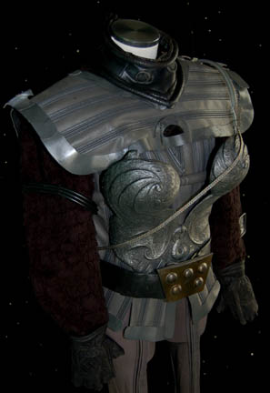 Description: A Klingon female uniform featured in the Star Trek: Deep Space Nine episode “Sons and Daughters” for wear by Gabrielle Union in her role as “N'Garen” with elements of other uniforms for a more complete lot. The costume is a set of gray spandex trousers located separately of the costume with a tag indicating them to be part of the costume of “Vixis” (Spice Williams) from Star Trek V: The Final Frontier, with a gray vinyl uniform top with black faux fur sleeves, attached Klingon heraldic badges on the left arm, a metal shoulder aglet, a black leather belt with a metallic gold colored buckle, a molded fiberglass breast and torso armor plate with a molded cobra snake in the center, the reverse of which features a label reading ‘bad Klingon don’t use’ and ‘Oppenheim’ and features strategically placed holes for uniform attachment. An interior label reads ‘Gabrielle Union’.