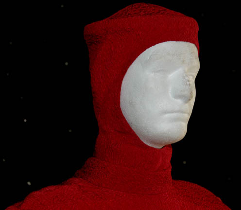 Description: A set of red surgical scrubs featured various episodes of Star Trek: Deep Space Nine like “Life Support” for wear by Siddig El Fadil in his role as “Dr. Bashir”. The costume is red textured trousers with a long sleeved gown and a cap that covers the whole head except for the face with the stylized flat circle top. The sewn in Voyager tags read ‘Siddig El Fadil'.