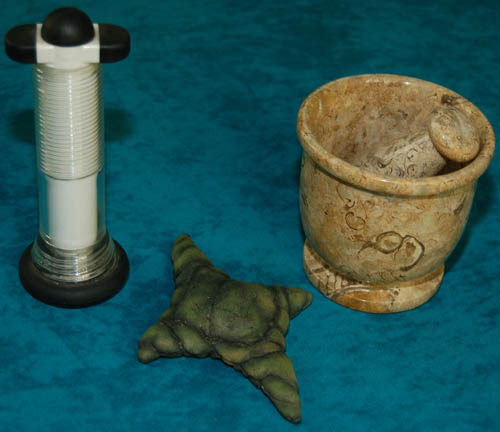 Description: A lot of prop items featured in various episodes of Star Trek: Enterprise, such a “Marauders” or “Exile” for use by “Dr. Phlox” (John Billingsley) in his unconventional treatment of the crew's wounds and maladies. This lot includes a tan, terrazzo, mortar and pestle, a clear plastic tube with a white rod inside that seems to be some kind of grinding device, and a cropped-top pentagonal , polished wood box with a metal latch on it. Also included is the osmotic eel, the life form that “Dr. Phlox” would use to repair arteries and phaser burns; it is green foam rubber and resembles a starfish but has suckers on the bottom of it that conjure images of the “face-hugger” from the “Aliens” series. Everything fits in the wooden case and it measures approx. 11 X 6.5 X 10 inches.