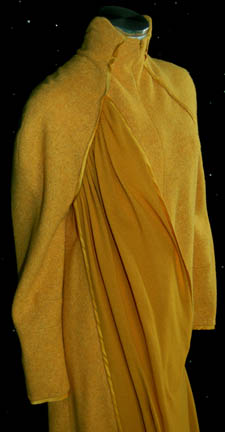 Description: A costume featured in the Star Trek: The Next Generation episode “The Vengeance Factor”; wherein the ”Enterprise-D” is called in to negotiate with a nomadic group of marauders called “The Gatherers” to halt their raids of other planets. This costume is for wear by Nancy Parsons in the role of the Acamarian Sovereign “Marouk”, and is a marigold-colored, full-length, long-sleeved, wool robe featuring a slightly darker colored sewn on sash that wraps around the left side and silken accents. The costumer's tag reads ‘#157 TNG The Vengeance Factor, Marouk, Nancy Parsons’.