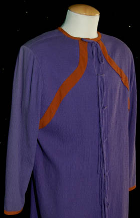 Description: A Bajoran surgical gown appearing in various episodes of Star Trek: Deep Space Nine. Three Deep Space Nine tags are sewn in indicating wear by Andrew Robinson as “Garak” in the episode “The Wire”, Armin Shimerman as “Quark” in the episode “Bar Association”, and Colm Meaney as “O'Brien” in the episode “Armageddon Game”. The gown is purple colored textured fabric with a gold-orange pair of stripes running down from under the arms and around each sleeve cuff. It is capable of being tied from the rear.