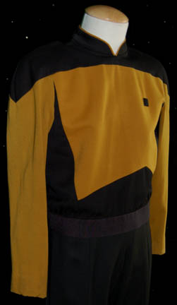 Description: A Starfleet operations gold uniform in the third season style made for wear on the Star Trek: The Next Generation series. The jacket is gold and black with gold trim around the collar. It has a zip and snaps up the back and a small Velcro patch on the front for a Combadge (not included) to attach. Due to time and storage there is some fading on the sleeves. The corresponding trousers are black. Costume comes complete with costume tag.