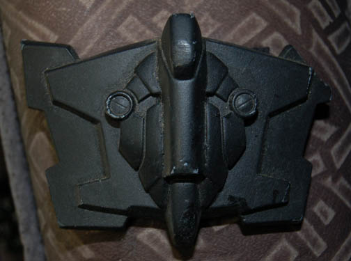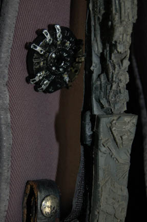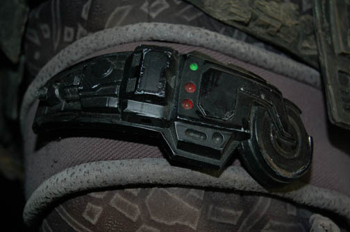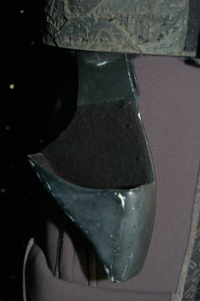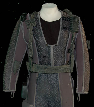 Description: A costume lot featured in various episodes of Star Trek: Deep Space Nine for wear by actors portraying Jem'Hadar. The costume is composed of neoprene overalls with stamped in pattern and a functional flap topped pocket, a uniform jacket top with multiple Velcro placements for corresponding molded resin and rubber accents, a pair of matching boots (size 12), a neoprene vest, and a molded rubber belt and harness built on a black nylon belt. Multiple sewn in show tags indicate use by multiple actors.