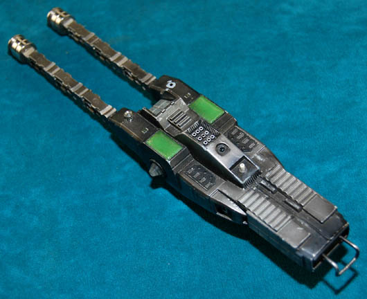 Description: A Borg subdermal probe featured in the Star Trek: Voyager episode “Dark Frontier” in which the Borg tried to re-assimilate “Seven of Nine” (Jeri Ryan) so she in turn could assimilate Humanity. The probe is made of resin painted gun metal gray with metal components added for detail. A small button on the top activates five green LED lights, two of which flash intermittently. Measures approx. 9 ¼ x 2 x 1 ½ inches.