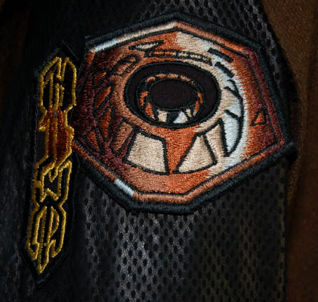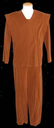 Description: A costume lot from the Star Trek: Voyager episode “Workforce” in which the crew of the U.S.S. Voyager were captured by a massive industrial consortium and brainwashed into believing they'd been employees of the company forever. The lot includes a shiny blue male jumpsuit with a matching belt, a zip up the front, and an orange, blue and white sewn on division patch on the left shoulder front depicting ‘Quarren’ character letters. A Quarren security costume that includes a brown wool coat with black leather sleeves and collar and a zip up the front. On the sleeves are Quarren security patches one of which depicts ‘Quarren’ character letters. On the right side of the chest is a round Velcro patch. The accompanying trousers are black leather as is the black belt and holster. A “Med. Tech.” Costume that includes a brown shirt that zips at the front and has pleated detail around the shoulders along with a pair of matching brown trousers. A “patient” costume that has criss-crosses at the front and snaps into place on each side. There are pleats around the shoulder for detail. Costumes come complete with costume tags.