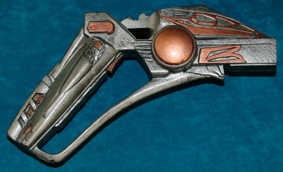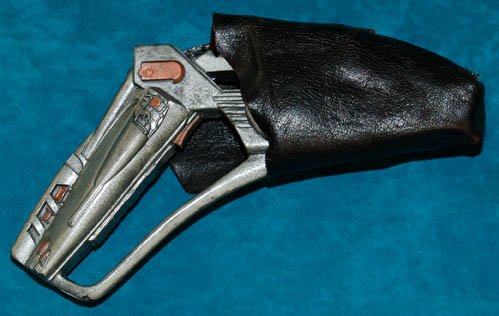 Description: A Hirogen energy pistol featured in various episodes of Star Trek: Voyager and appearing as a Vulcan energy pistol in the Star Trek: Enterprise episode “Kir'Shara”. The item is high quality molded rubber painted metallic silver with bronze colored accents, and it comes with a leather holster with a military style clip. The item in the holster measures approx. 10.75 X 5.5 X 3 inches.