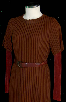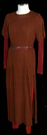 Description: A lot of two identical costumes feature variously in Star Trek: Deep Space Nine. The costumes are a form fitting full length gown type dress colored iridescent brown with a second layer of brown corduroy-like material that is striped. The dressed both come with a woven brown leather belt and feature sewn in Deep Space Nine tags, one reading ‘Denise Roberts', the other ‘Nana Visitor’. The costumer’s tag reads ‘DS9, Kira, Nana Visitor, 2 Brown Dresses w/belts (dbl.), 2 brown stretch jumpsuits (dbl.)’.