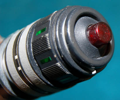 Description: A medical device located on the “Doctor's” (Robert Picardo) tray in the Star Trek: Voyager episode “Message in a Bottle”. The device is made of resin and metal with numerous applications added for detail. A small red button on the end activates an orange LED light at the tip. Measures approx. 5 ¼ x 1 ½ inches diameter.