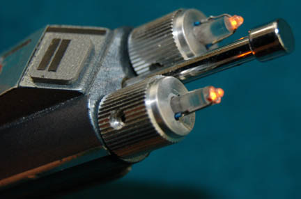 Description: An electronic prop engineering device used on a Druoda Series 5 long range tactical armor unit by “B'Elanna Torres” (Roxann Dawson) in the Star Trek: Voyager episode “Warhead” in order to remove the artificial intelligence from the warhead. The device is made of resin painted gray with black acrylic and metal components. Black, red and silver applications are added for detail. A small blue button on the top activates two small orange LED lights located on two tips. A bonus metal stylus and two additional V357 batteries are also included. Measures approx. 4 ½ x 1 ¼ x 1 ½ inches.