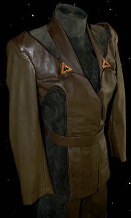 Description: “B'Elanna Torres” (Roxann Dawson), half-human and half-Klingon, was Chief Engineer onboard the U.S.S. Voyager during the Star Trek: Voyager series. This costume was made for wear in the Star Trek: Voyager episode “Remember” in which Torres received vivid dreams caused by an Enaran onboard the ship. The costume includes a dark green leather and suede tunic with matching trousers, a belt and a green suede dickie. The tunic has two gold painted resin accents on each side of the chest which were not present in the episode, possibly indicating this costume was reused at a later date for another purpose. The corresponding heeled boots are black leather. Costume comes complete with costume tag.
