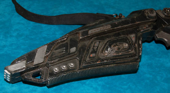 Description: A molded rubber Bajoran phaser rifle featured in various episodes of Star Trek: Deep Space Nine. The item is painted metallic black and silver with multiple molded details to suggest hardware with an affixed black nylon shoulder strap and a molded hand grip fitted for fingers. The item appears to have been altered in that typical Bajoran phaser rifles seen onscreen featured an additional guard from the grip to under the receiver, this one is missing that presumably due to alteration for further use in other Star Trek productions. The prop measures approx. 25.5 X 7.75 X 3.75 inches.