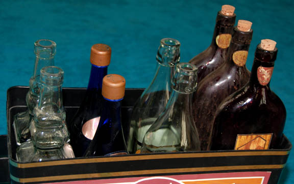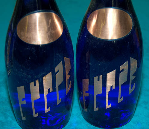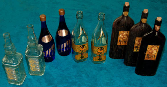 Description: A black plastic carrying case featured in the Star Trek: Deep Space Nine episode “Body Parts” with a lot of eight alien bottles not associated to the case. The case appeared in the hands of “Dr. Bashir” (Alexander Siddig) as he entered “Quark's Bar” to give them to the Feregi barkeep as he had tried the contents and saw the alcohol to be “undrinkable”. The case features metallic gold colored adhesive details and graphical applications on both the sides meant to be alien iconography. What we assume to be ‘alien’ duty labels have been applied to both sides of the case. The bottles are all glass of varying colors and feature applied graphical labels with alien character lettering and designs which were featured variously in Star Trek episodic television (thus far, the bottles featured in the Deep Space Nine episode appear lost to the ages). The two dark blue bottles appear to be filled with water and never to have been opened, three of the brown colored bottles feature corks and each is labeled with a graphic of indicating that it is from the planet ‘Triskelion’. The case with the bottles held within measures approx. 8 X 18.5 X 14.5 inches.