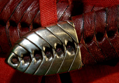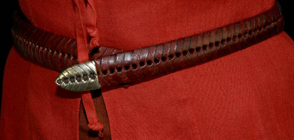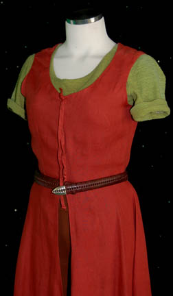 Description: A costume featured in the Star Trek: Deep Space Nine episode “Equilibrium” for wear by Nana Visitor as “Major Kira” as part of a dinner party being held by “Commander Sisko” (Avery Brooks) for his command crew. The costume is a pair of jumpsuits made from orange colored legs and an attached green colored top with short sleeves, and a red colored outer gown. The costume also comes with a rust colored leather belt. One set features sewn in Deep Space Nine tags, and the costumer's tag reads ‘450 DS9 Equilibrium, Kira, Nana, 2 jumpsuits green top brown bottom, 1 overdress – rust linen, 1 rust leather – belt’. ‘vest – green long crochet’ is crossed out.