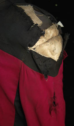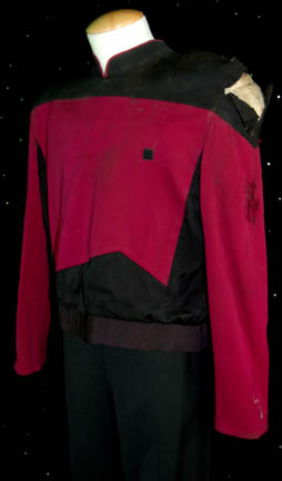 Description: A costume featured in the Star Trek: The Next Generation episode “Genesis”; wherein “Captain Picard” (Patrick Stewart) and “Lt. Commander Data” (Brent Spiner) return to find the “Enterprise-D” adrift and that the crew have devolved into primitive creatures. This costume is for wear by Jonathan Frakes after he has devolved to the neanderthaloid “Commander William Riker” and is a Starfleet uniform jacket featuring Command Red division strip along the chest, sleeves and back; further red piping around the collar, a Velcro patch on the left breast for a commbadge (not included), a zip down the back, and matching black trousers with stirrups for the feet. The costume is significantly distressed to emulate “Commander Riker's” devolution with the entire left shoulder torn open, extra padding added, and various rips and general distress. A sewn in tag reads ‘Star Trek: TNG, J. Frakes’ and the costumer’s tag reads ‘271 Genesis, Riker, Jonathan Frakes’.