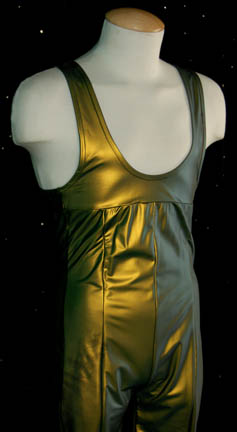 Description: A costume featured in the Star Trek: Voyager episode “Tsunkatse”; wherein “Seven of Nine” (Jeri Ryan) and “Lt. Commander Tuvok” (Tim Russ) are kidnapped by a devious fight promoter who forces “Seven” to fight in spectator sport he had invented called “Tsunkatse”. This costume is a sleeveless, metallic-green, vinyl jumpsuit with a very low front, a zip down the back, stirrups for the feet and matching, metallic-green, Nike athletic shoes. The name “Doug Wilson” is written on the inside of the garment and the costumer's tag reads ‘Voyager 232 Tsunkatse, Alien Fighter, Doug Wilson’.