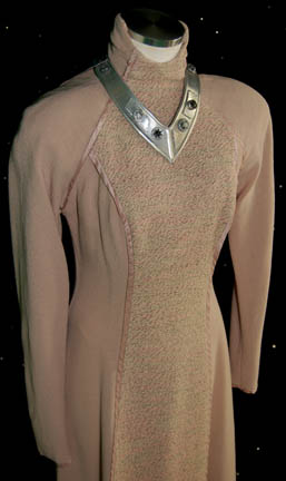 Description: “Yuta” (Lisa Wilcox) was the last surviving member of the Tralesta clan whose mission was to hunt down and kill the Lornak clan responsible for decimating her people in the Star Trek: The Next Generation episode “The Vengeance Factor”. Her costume includes a long taupe dress with flecks of pink and a central panel with piping. Around the neck is a metal collar with metal and resin accents and suede backing. A second collar is also included. Costume comes complete with costume tag.