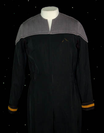 Description: A Starfleet uniform in the style that made its first appearance in Star Trek VIII: First Contact comprised of a full-length black jumpsuit with gray quilted shoulders. The jumpsuit features black elastic stirrups at the feet, a form fitting elastic waistband sewn inside with attached loops for ‘away team' gear, a Velcro patch on the left breast for a combadge (sold separately), and a operations gold division stripe at the cuff. The uniform zips up the front and comes complete with a separate long sleeved undershirt matching the division cuff color that zips up the front. Uniforms like this were also seen in Star Trek: Deep Space Nine from the middle of season five through the end of the series during season seven, in late seasons of Star Trek: Voyager, and in Star Trek IX: Insurrection and Star Trek X: Nemesis. The costumes were worn by various actors as indicated by the sewn in ‘MUTO Little, Los Angeles’ tag inside.