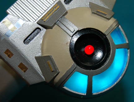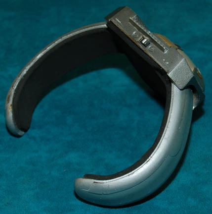 Description: A prop Starfleet medical device used on “Miles O'Brien” (Colm Meaney) to administer Delta isotopes in the Star Trek: Deep Space Nine episode “Visionary”. The device administered the exact amount of isotopes to sent O’Brien three hours into the future so he can learn what’s happening to him. The device has a silver and taupe painted resin front with three blue lights and one red flashing LED light activated by a switch on the top. Gold paint and gold and silver colored applications are added for detail. The painted silver arms are made of rubber for flexibility to attach around O’Brien’s arm. The backing is foam rubber that covers the screwed on battery compartment. A new J battery was inserted for convenience. Measures approx. 3 x 4 ¾ x 4 ½ inches.