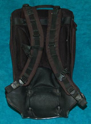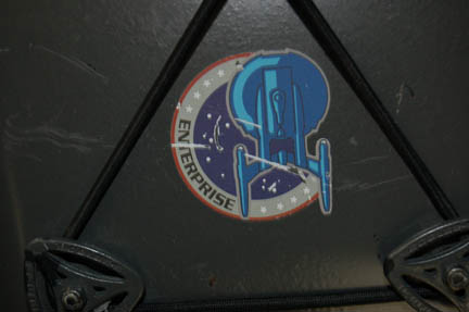 Description: A prop backpack featured in multiple episodes of Star Trek: Enterprise. The item is a molded plastic shell on a black nylon fabric padded backing with shoulder straps and an elastic flap cover. The cover features a bungee string that wraps around mounted triangles to fasten closed with a tension altering slide. The interior features multiple zip pockets and stowage cavities, the exterior is adorned with an “Enterprise NX-01” assignment logo application with scratches evident across it, and there are other scratches on the shell due to set use, time or storage conditions. The item measures approx. 22 X 13.25 X 6 inches.