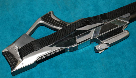 Description: A solid cast resin prop Starfleet Type III Mark III phaser rifle featured in Star Trek X: Nemesis. The item is painted metallic silver with black painted hand grips and details, a mounting for a flashlight, with metallic silver foil accents, a molded ‘targeting scope' which is broken due to time and storage conditions, with a black nylon shoulder strap mounted in a fixed position with adhesive tap size adjustments, and a molded trigger. The item measures approx. 32.25 X 9 X 2 inches.