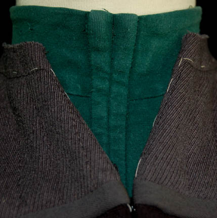Description: A costume featured similar to those featured throughout the last season of Deep Space Nine for wear by Nicole DeBoer in the role of the ninth host of the Dax symbiont and counselor of Deep Space Nine, “Ezri Dax”, and is an unfinished Starfleet uniform of the style that was first used in the feature film “First Contact” and went on to become the standard; it consists of a long-sleeved, full-length, black jumpsuit featuring blue-gray, quilted shoulders, a Velcro patch for a commbadge (not included), a zip down the front, a Sciences blue undershirt sewn onto a flesh-colored undergarment, and white tacking along the zip, collar, wrist and ankle cuffs. The costume includes two extra undershirts and a sewn in tag which reads ‘Deep Space Nine, Nicole de Boer' and is the last “Ezri Dax” uniform heretofore located.