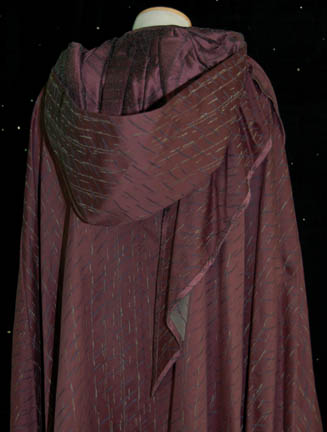 Description: A costume featured in the Star Trek: Deep Space Nine episode “House of Quark”; wherein “Quark” (Armin Shimerman) takes credit for killing a Klingon who was actually so drunk he fell on his own blade which makes his widow show up and kidnap him back to Qo'nos to marry him so she can keep control of her House. This costume is for wear by Mary Kay Adams in the role of the Klingon widow who must marry “Quark” or lose everything she has, “Grilka”, and is a full-length, wrap-around, hooded, cloak in a mauve shade featuring diagonal blue stripes and vertical gray stripes. The costumer’s tag reads ‘DS9 #449, Grilka, Mary Kay Adams’.