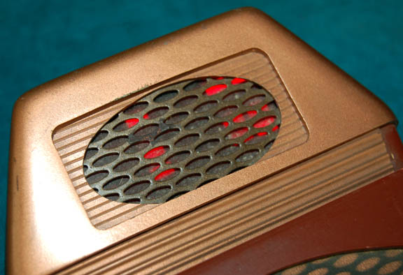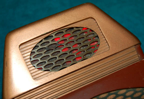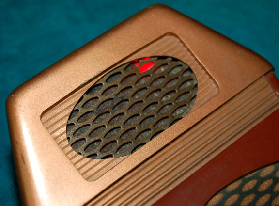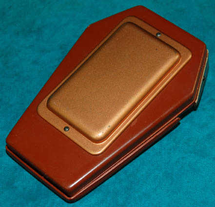 Description: A prop item featured in several episodes of Star Trek: Voyager, “The Cloud” and the second season finale episode “Basics: Part I. This item is an “Akoonah”: Native Americans in the 24th century would use it instead of the psychoactive herbs used today to initiate a vision quest, i.e. when “Commander Chakotay” (Robert Beltran) used his to seek his father's or his animal spirit’s guidance; it is a rust/copper colored, roughly hexagonal shape with the lower 2/3 dominated by a soft fabric featuring a screen printed design and pressing an area near the middle-front will cause random red lights to dance across a smaller, oval-shaped screen on the upper part of the device. On the back is a panel held close with two allen -wrench screws where the batteries to the device are held and the item measures approx. 6.5 X 4.5 X 1.5 inches.