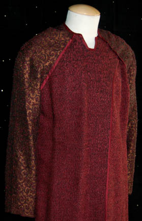 Description: A costume featured in the Star Trek: Deep Space Nine episode “Rejoined”, wherein “Lieutenant Jadzia Dax” (Terry Farrell) is reunited with the recipient of the Kahn symbiont, whose previous host was the wife of one of her previous hosts and the inevitable, old feelings begin to surface again even though joined Trill are seriously discouraged from interacting with people from previous hosts' lives. The costume is for wear by Tim Ryan in the role the brother of “Lenara Kahn” (Susanna Thompson) who tries to remind her of what will result from fraternization with someone a previous host was involved, “Bejal Otner”, and is a long-sleeved, robe-length tunic featuring a textured burgundy/black along the abdomen, matching satin accents around the collar and down the front, intricate gold-threaded floral patterns on the arms, matching overall style trousers with stirrups that have been cut out. A sewn in tag reads ‘Deep Space Nine, Tim Ryan’ and the costumer’s tag reads ‘DS9, #478, Bejal, Tim Ryan, Trill’.