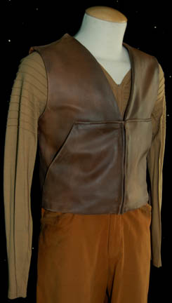 Description: A costume featured in the Star Trek: Enterprise episode “The Communicator”, wherein “Lt. Reed” (Dominic Keating) accidentally leaves his communicator on a pre-warp civilization and when he and “Captain Archer” (Scott Bakula) go back for it, they are captured and accused of espionage. This costume is for wear by Dominic Keating in the role of the Armory Officer of the “Enterprise NX-01”, “Lieutenant Malcolm Reed”, and is a long-sleeved, tan shirt featuring raised, horizontal stripes around the entire garment, a weathered, brown, leather vest with pockets, and clay-colored trousers. All items are lightly distressed for effect and a sewn in tag reads ‘Enterprise, Dominic Keating'.