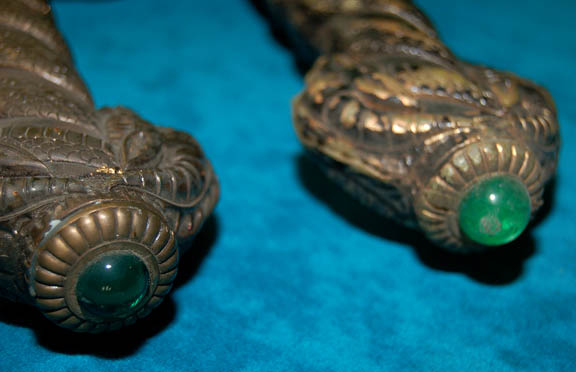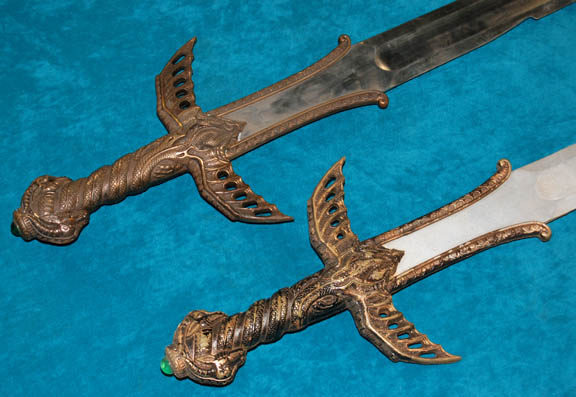 Description: A prop metal and a prop stunt sword featured variously in Star Trek episodic television. The items resemble double sided blades with a dragon or reptile motif for the guard, grip, and pommel. Both items feature green colored faux gems embedded in the pommel. The metal one is beveled to appear sharpened, the stunt sword is molded rubber painted to match its counterpart, and built around an internal metal frame. The items measure approx. 8 X 32 inches.