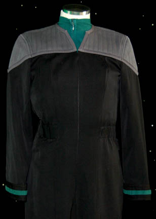 Description: A black Starfleet uniform jumpsuit with gray quilted shoulders and sciences blue division strips on the cuffs featured in Star Trek X: Nemesis. The costume also comes with a sciences blue division long sleeved zip front undershirt. The costume is intended for female wearers.