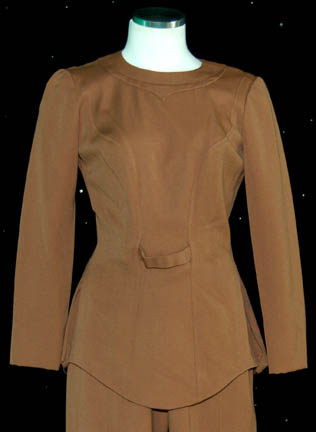 Description: A brown 2-piece Class-A Starfleet uniform featured in Star Trek I: The Motion Picture. The lot comes with an unattached plastic bio-monitor, unattached matching cloth covered shoes, and an engineering red backed Epsilon IX station assignment patch for the left breast. The item is intended for female wearers.
