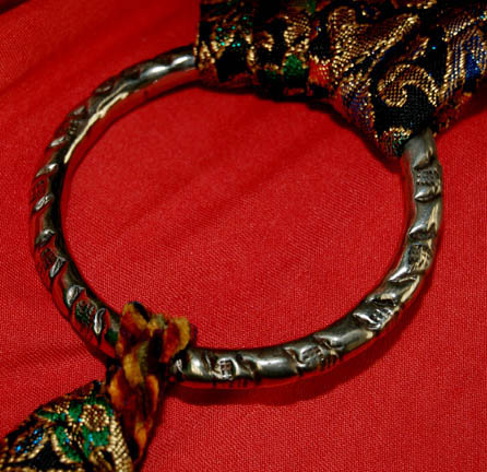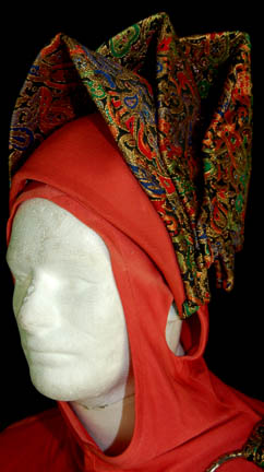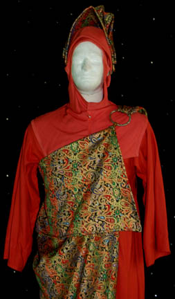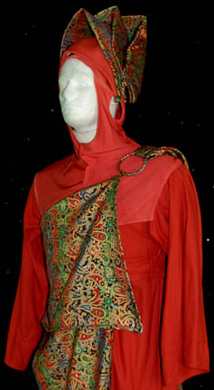 Description: A costume similar to those featured throughout the entire Star Trek: Deep Space Nine series. This costume is that of a Bajoran Vedek, part of the governing body of Bajoran religion and seemingly about the same as a Catholic cardinal; it consists of a long-sleeved, full-length red-orange robe featuring a sash around the waist, an extravagant, black wrap that goes over the left shoulder, featuring a multi-colored paisley pattern, reflective “jeweled” accents, and a decorative metal ring that sits on the left breast; a red-orange coif to be worn under a matching hat featuring the same multi-colored motif in a triple steepled design that summons imagery of the famous Sydney, Australia Opera house. Sewn in tags denote wear by “Ray Berrios” and “Satoru Nakamura” and the costumer's tag reads merely ‘DS9, Bajoran Vedek’.