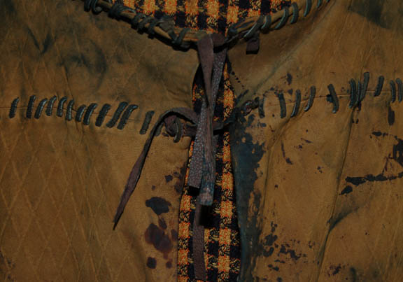 Description: A costume featured in the Star Trek: Deep Space Nine episode “Progress”; wherein a farmer and his friends refuse to leave their dwelling on one of Bajor's moons even though it is going to be made uninhabitable because of a plan by the Provisional Government to use the molten core to generate energy. This costume is for wear by Terrence Evans in the role of one of the Bajorans that resisted relocating from the moon, “Baltrim”, and is a long-sleeved, orange and black checkered shirt, a stained, light brown, vest made of pieces of leather stitched together with leather cording, brown and black houndstooth trousers that have had the overall straps cut out, large leather kneepads in the same piecemeal fashion, and stirrups for the feet. A sewn in tag in each garment denotes wear by a different person but all three items were found together and the costumer’s tag reads ‘DS9 415, Baltrim, Terrence Evans’.