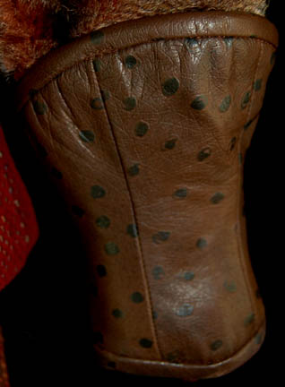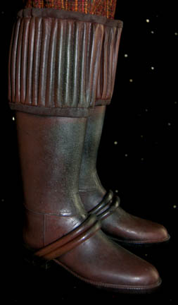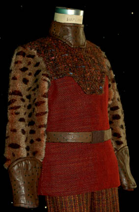 Description: This costume was made for wear by a civilian Klingon child in the Star Trek: Deep Space Nine episode “Rules of Engagement” in which “Worf” (Michael Dorn) tried to avoid extradition by the Klingons after he accidentally destroyed a transport ship carrying Klingon civilians. The costume includes a top with a woven multicolored torso and faux fur sleeves. The corresponding trousers are multicolored woven wool. A brown leather spotted belt with Velcro fastening attaches through belt loops on the jacket. Also included are brown leather spotted wrist gauntlets, collar and painted brown high boots. The boots have rubber rings attached around the top and across the top of the foot. Costume comes complete with costume tag.