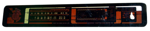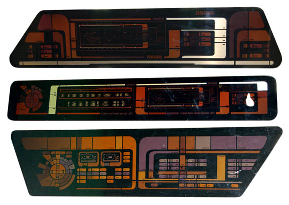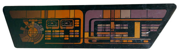 Description: A lot of three LCARS (Library Computer Access and Retrieval System) style panels. One panel is believed to be from a Star Trek: Deep Space Nine runabout set, vaguely trapezoidal in shape the item is a piece of smoked acrylic with a graphical application adhered to the reverse which appears when backlit. The item depicts a circular multi-colored pitch and attitude control on the left with multiple status bars, and faux buttons positioned throughout. The other two items are similar except in size and appearance. One features metallic gold adhesive details across the control surface and is rectangular with rounded corners. It appears as a readout screen and features a graphic of what may be island topography which is represented as ‘Standby Phase Variant Analysis'. A section of the graphic is torn away on the right side. The third item is similar with metallic gold detail on the surface, but is trapezoidal and features a closer view of the topographic display. The items measure approx. 53 X 13 inches, 53 X 8.5 inches, and 41.25 X 9 inches respectively. They all appear to have been created for insets of a control console as opposed to having been positioned on a wall.
