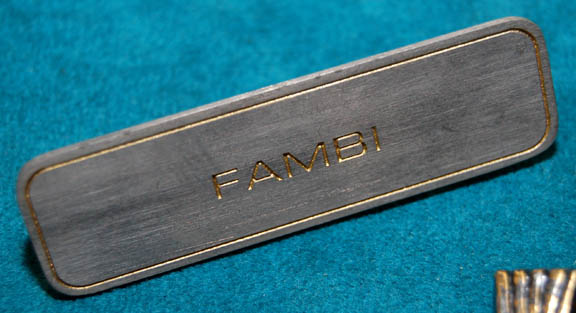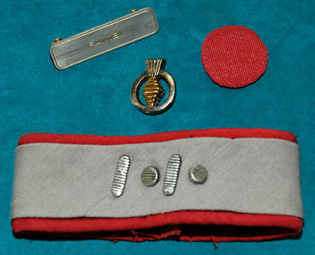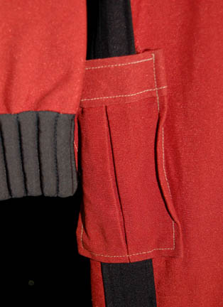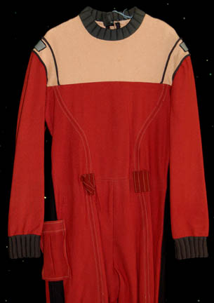 Description: A Starfleet uniform jumpsuit of the style appearing first in Star Trek II: The Wrath of Khan and continuing service through at least Star Trek VI: The Undiscovered Country. The costume is red with black lining and tan colored shoulders and chest. The black ribbed collar and cuffs indicate the wearer to be a crewman and the gray shoulder mounted division strips indicate the wearer to be sciences division. These unattached elements accompany the uniform, a pin backed metallic silver name badge reading ‘FAMBI' in etched lettering, a red rank placement with an unattached metallic silver and gold badge indicating the wearer to be a ‘master chief petty officer’, and a red bordered gray division strip for the left sleeve with two attached silver colored metal commendation bars and two ‘5 year service’ pins.