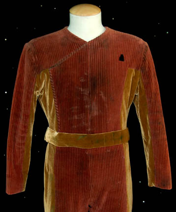 Description: This great costume was worn by “Neelix” (Ethan Phillips), a Talaxian who served as a chef onboard the U.S.S. Voyager during the Star Trek: Voyager series. The jumpsuit is ribbed terracotta color with brown strips down each side and down the inner sleeves. There is a small Velcro patch on the left side of the chest for a Combadge (not included) to attach. There is some intentional dirt distress to sections of the costume most notably on the legs. A brown corresponding belt is also included. The sewn in tag reads “Voyager – Ethan Phillips”.