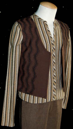 Description: A costume featured in the Star Trek: Deep Space Nine episode “In the Cards”; wherein “Jake Sisko” (Cirroc Lofton) and “Nog” (Aron Eisenberg) engage in “favors” for half the people on the station in an attempt to gain a “Willie Mays” rookie card in perfect condition as a way of cheering up the particularly gloomy “Captain Sisko” (Avery Brooks). This costume is for wear by Cirroc Lofton in the role of the aspiring journalist and song of the station commander, “Jake Sisko”, and is a long-sleeved, tunic featuring vertical stripes in white and shades of brown, two matching dark-brown vests (one character and one either photo double or stunt) with a black zigzag pattern that resembles stalks of wheat and textured horizontal stripes, and brown, houndstooth trousers. A sewn in tag reads ‘Deep Space Nine, Cirroc Lofton' and the costumer’s tag reads ‘DS9 Season 6,7, Jake Sisko, Cirroc Lofton’.