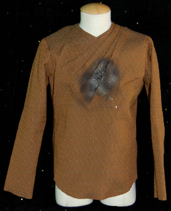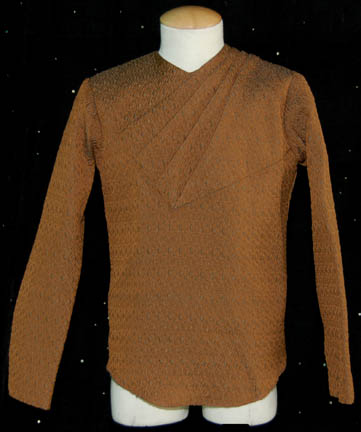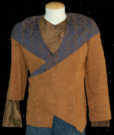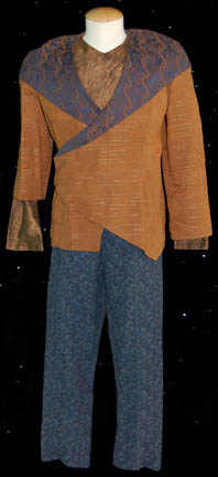 Description: A costume featured in the Star Trek: Deep Space Nine episode “The Magnificent Ferengi”; wherein “Quark” (Armin Shimerman), “Nog” (Aron Eisenberg), “Rom” (Max Grodenchik) lead some Ferengi on a journey to Empok Nor to try to bargain a captured Vorta for their mother's freedom. This costume is a long-sleeved, light brown colored, shirt featuring a textured diamond pattern, diagonal pleating, a zip up the back, and identical shirt that has a large discoloration and small tear in it to denote a phaser blast he received that was meant for “Quark”; trousers featuring a two-tone blue raised pattern of random shapes, a long-sleeved shirt of the same style and pleating as the other but with a lighter brown color, an abstract spiral design, and are also distressed for effect. Lastly is a long-sleeved, over-jacket of a similar shade of brown as the rest of the shirts but with lighter shaded, staggered, horizontal stripes, and oversized blue collars featuring a gray floral design, vertical, orange and red, jagged stripes that cover the shoulders and wrap around the front of the garment. A sewn in tag in each garment reads ‘Deep Space Nine, Christopher Shea’ and the costumer’s tag reads ‘DS9, Keevan (Vorta), Christopher Shea’.