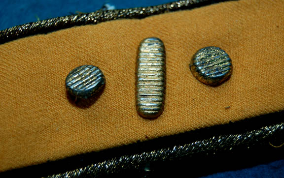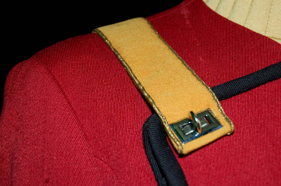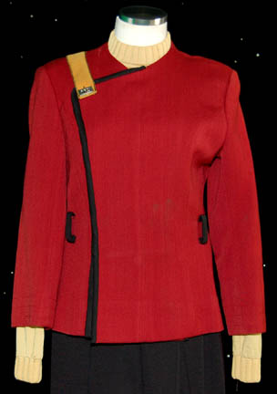 Description: A Starfleet uniform jumpsuit of the style appearing first in Star Trek II: The Wrath of Khan and continuing service through at least Star Trek VII: Generations after which they appeared variously in episodes of Star Trek: The Next Generation and “Flashback” of Voyager. The costume consists of black officer's trousers with an operations yellow division stripe down the outside seams of both legs, a red officer’s uniform with a double breasted front. The jacket features a sewn on yellow division shoulder strip and a tan chest interior. The uniform comes with a yellow long sleeved undershirts with a ribbed collar and cuffs, and a division strip for the sleeve with a gold colored metal commendation bar and a pair of ‘five year service’ pins. The uniform is intended for female wearers.