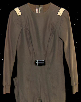 Description: A dark gray Class-D Starfleet uniform jumpsuit featured in Star Trek I: The Motion Picture. The costume comes with matching unattached cloth covered shoes, attached command white division-rank strips with thing gold thread embroidery, an attached plastic bio-monitor, and an unattached white backed Epsilon IX assignment patch. The rank lines on the division strips have been speculated to equivocate the rank of ‘crewman second class'. The costume is intended for female wearers. A costumer’s tag reads ‘Star Base Personnel’.